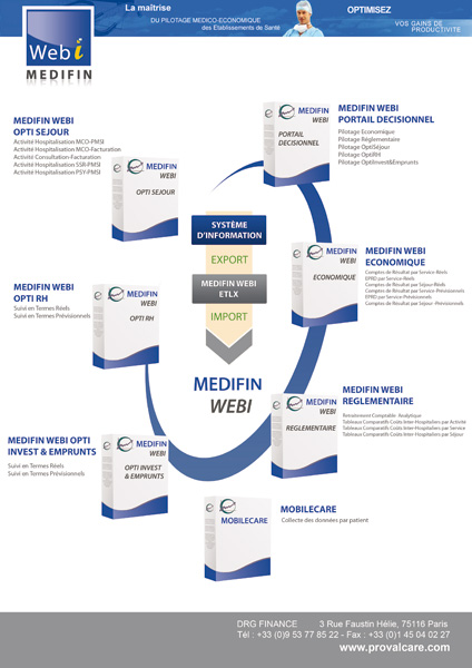 MEDIFIN WebI Economique&Réglementaire Application conçue par la Société DRG FINANCE présente sur le marché hospitalier français depuis 1995, est accessible dans sa nouvelle version Web en mode ASP (Application Service Provider) ou dans le cadre d’un INTRANET au sein de l’Etablissement.